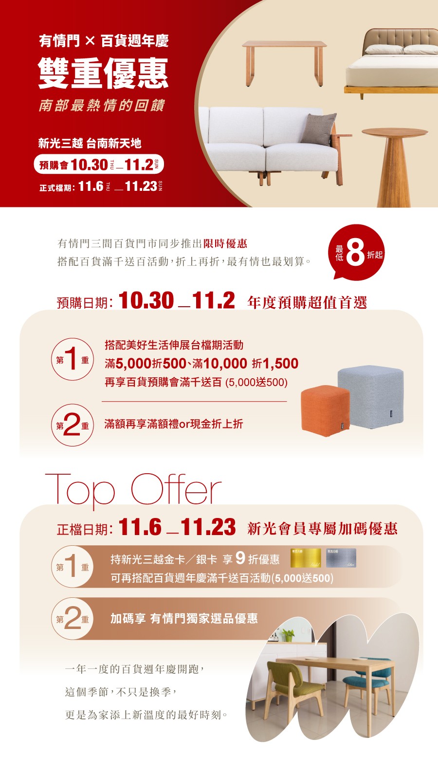 6.詳細活動內容請洽門市服務人員,有情門及百貨通路保有活動終止、變更、解釋之權利。