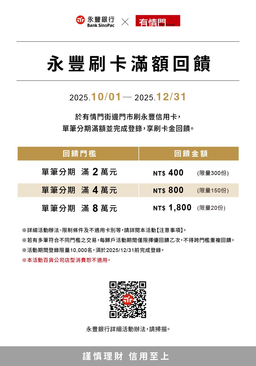 - 參加本活動,須由正卡持卡人於指定期間透過永豐銀行網站進行線上登錄,時間以本行系統時間為準,登錄本活動時請勿同時開啟多個視窗,並請以半形英數字登錄。逾期未登錄或資料輸入錯誤者,視同放棄及未符合活動回饋資格,恕無法補登參加;符合限量回饋名單,以符合活動門檻且同時成功登錄時間先後依序擇優回饋至額滿為止,不另行公告;若多筆交易或多通路交易同時符合多重滿額門檻時,活動期間每歸戶僅限擇一擇優回饋乙次,不得跨門檻重複回饋。