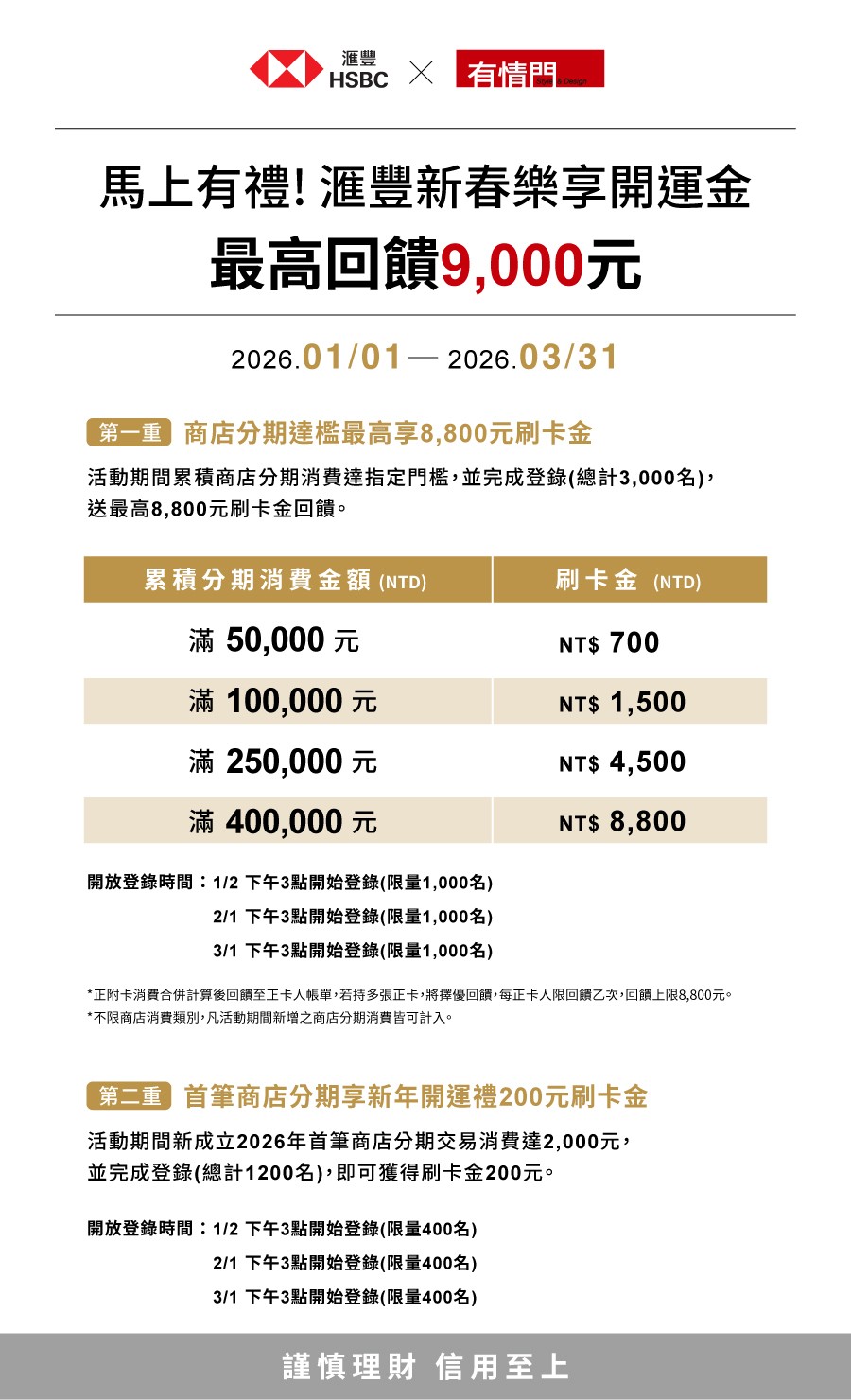 - <第一重:分期達檻最高享8800元刷卡金>與<第二重:首筆分期享新年開運禮 最高享200元刷卡金>於活動期間內登錄成功(以本行電腦系統之登錄順序為準)且符合刷卡資格,即可獲得回饋;若皆有登錄成功,可同時參加,且分期消費可重複計算。Ex. 若累積分期金額符合達檻符合<第一重:分期達檻最高享8800元刷卡金>,且同時符合2026年新成立之分期交易,則可獲得回饋刷卡金200 元。