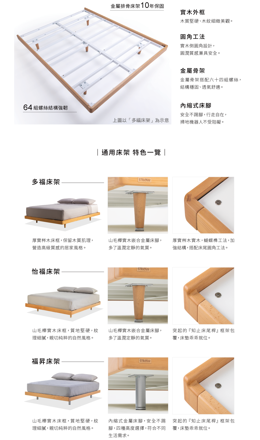 怡福床架:山毛櫸(床框/床腳)、塑合板、金屬骨架