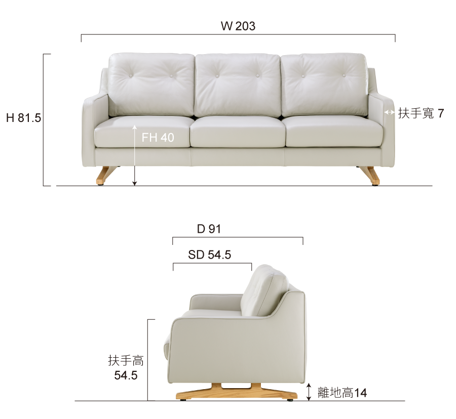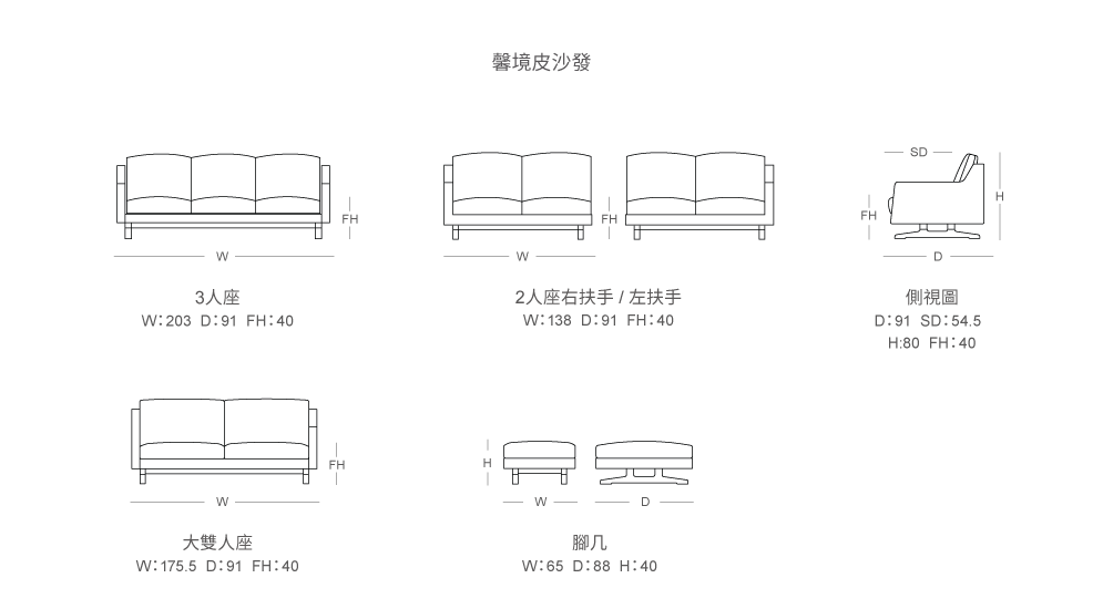 梣木實木(腳座)、雲杉實木(骨架)、樺木積層板(骨架)、高密度泡棉、牛皮、羽毛