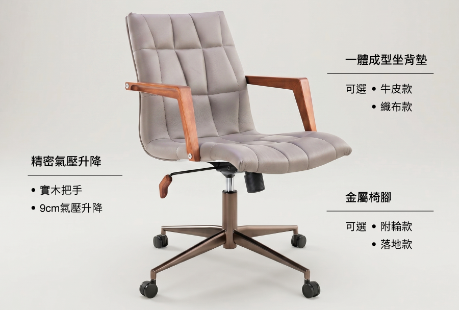 立體車縫線帶來更透氣的舒適體驗,巧妙地將人體工學隱於溫潤木質,完美平衡工作機能與居家美學