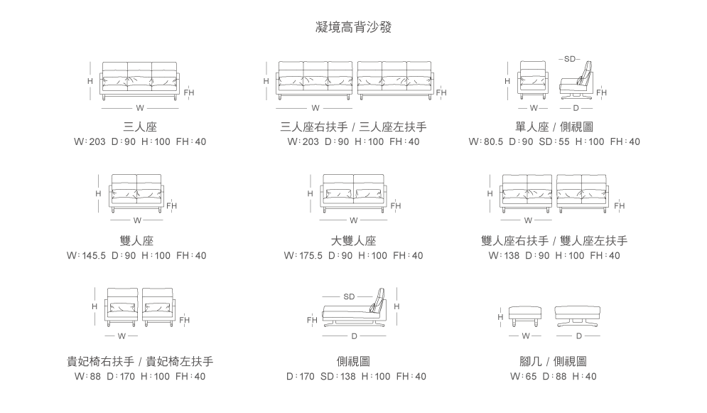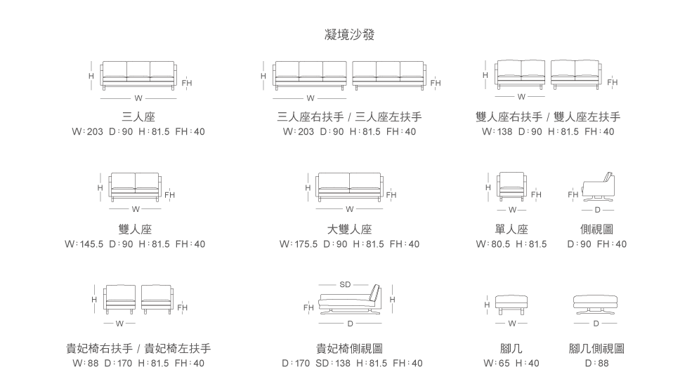 梣木實木(腳座)、雲杉實木(骨架)、樺木積層板(骨架)、高密度泡棉、可拆式布套(貴妃椅選用特定布款)、羽毛