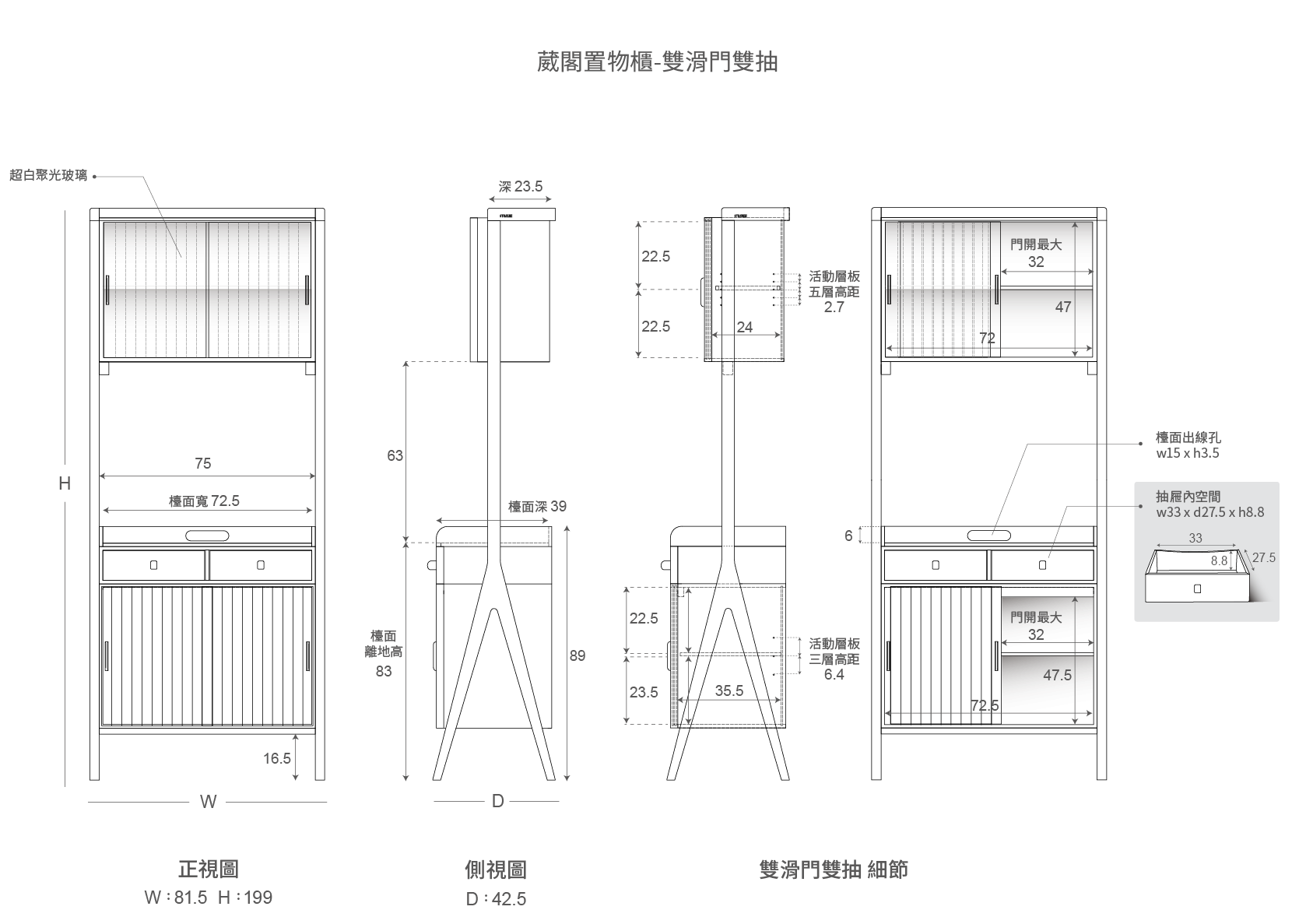 抽屜結合滑門式開闔的收納櫥櫃,降低動線干擾。